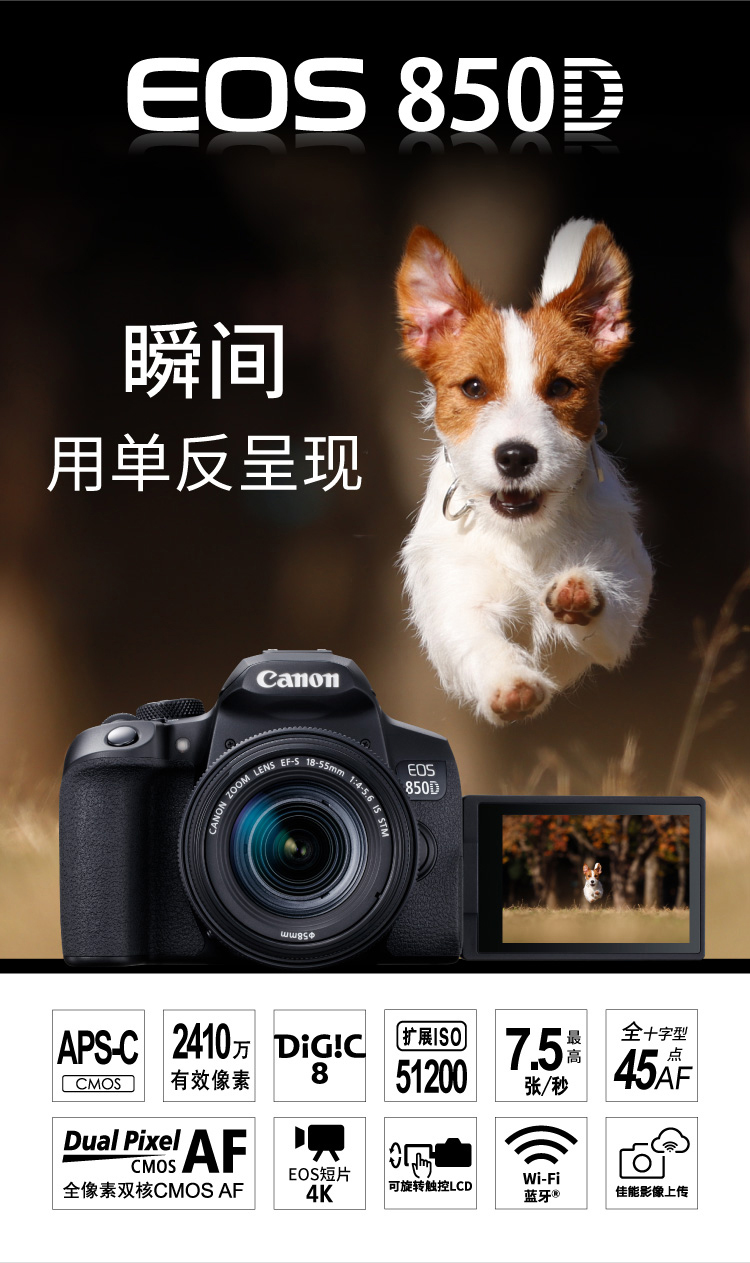 包裝清單  :   850D黑色機(jī)身、鏡頭、電池充電器、鋰電池LP-E17、相機(jī)背帶、說明書、保修卡、包裝盒、單肩包、存儲(chǔ)卡、UV鏡、三腳架