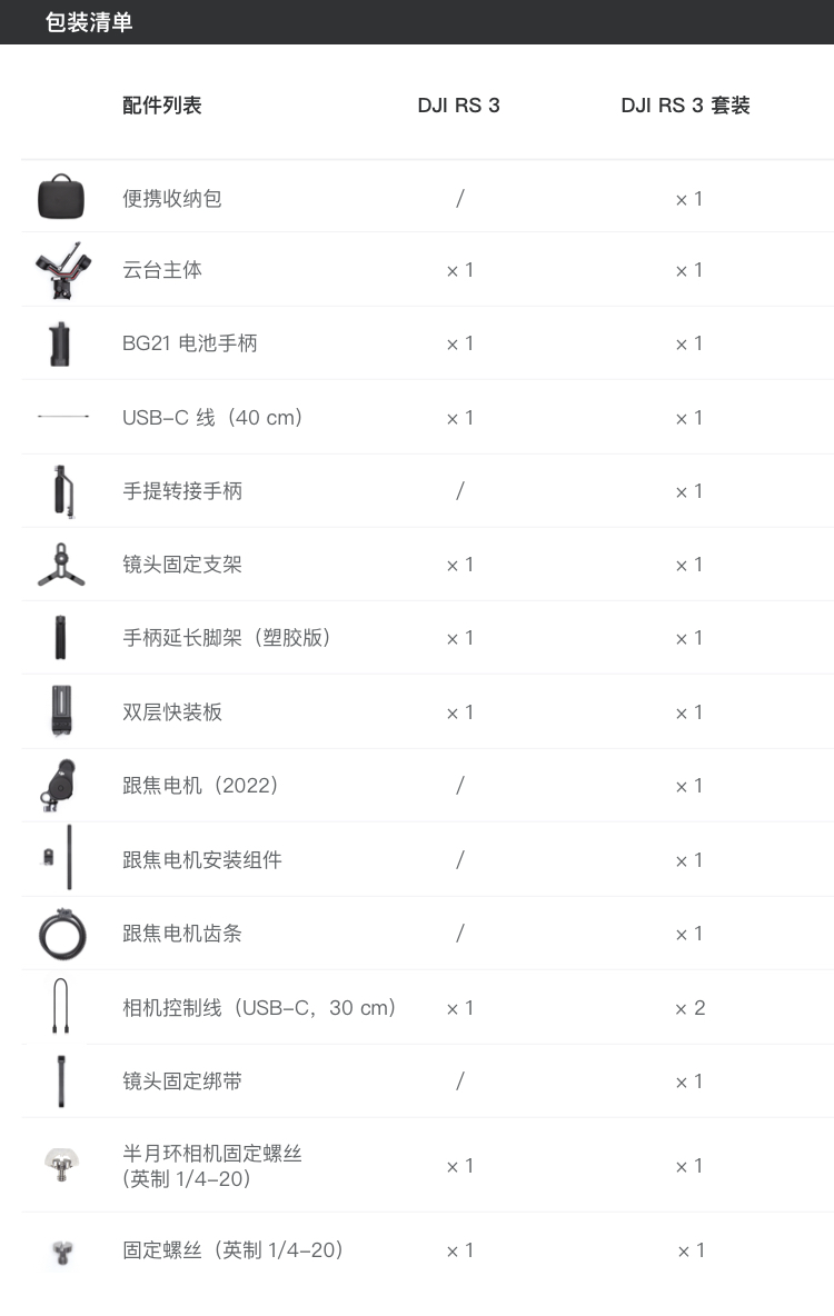 包裝清單  :   云臺(tái)主體×1、云臺(tái)主體×1、BG21 電池手柄×1、USB-C 線(40 cm)×1、鏡頭固定支架×1、手柄延長(zhǎng)腳架(塑膠版)×1、雙層快裝板×1、相機(jī)控制線(USB-C,30 cm)×1、半月環(huán)相機(jī)固定螺絲(英制 1/4-20)×1、固定螺絲(英制 1/4-20)×1