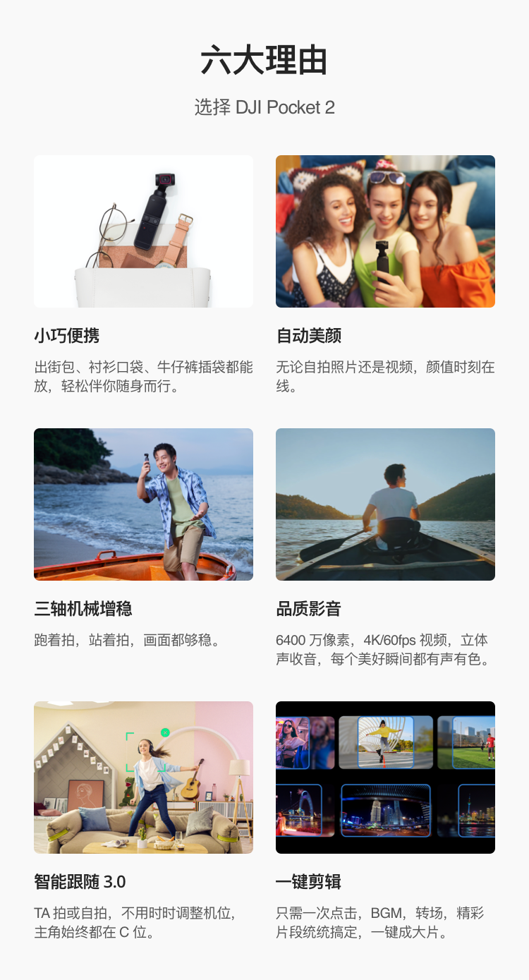 包裝清單  :   DJI Pocket 2×1、DJI Pocket 2 迷你搖桿×1、DJI Pocket 2 保護(hù)殼×1、DJI Pocket 2 三腳架轉(zhuǎn)接件(1/4")×1、DJI 手繩×1、Osmo Pocket 手機(jī)連接(Lightning接頭)×1、Osmo Pocket 手機(jī)連接頭 (Type C接頭)×1、充電線×1