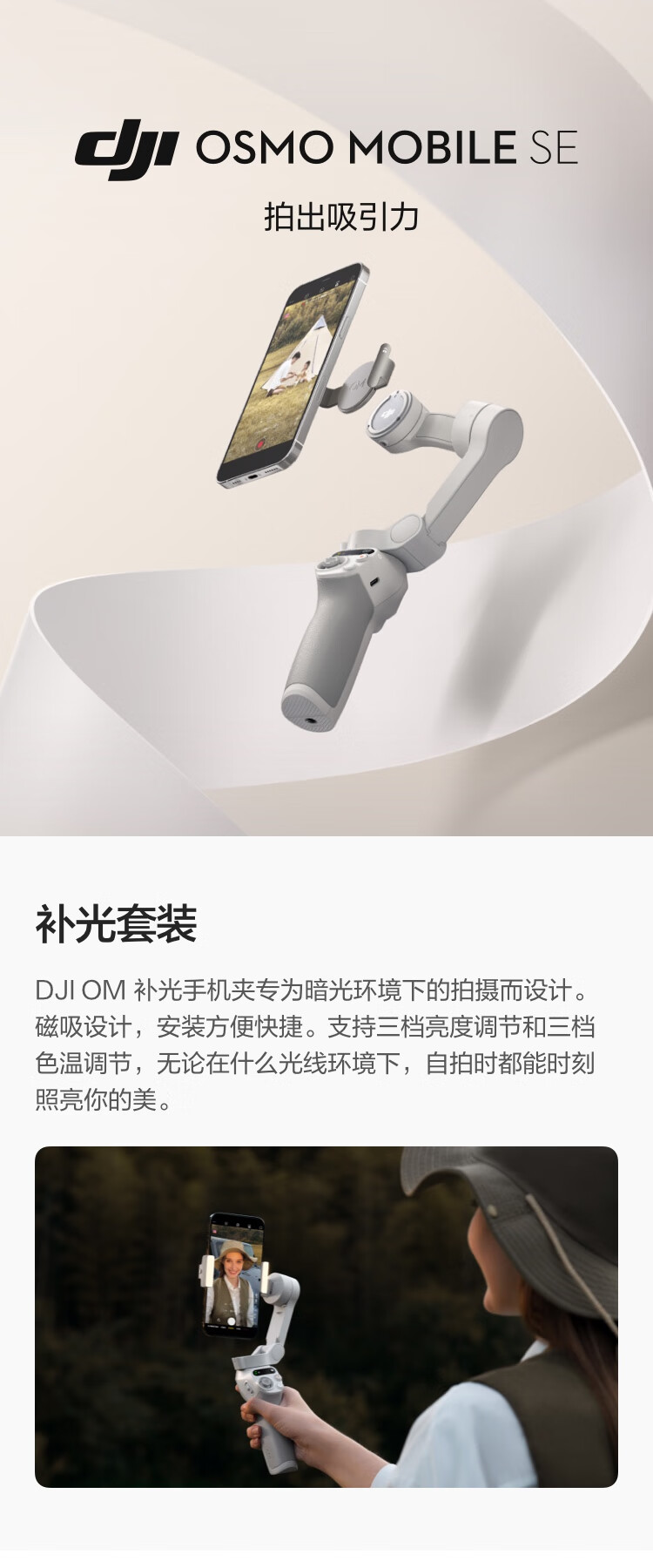 包裝清單  :   Osmo Mobile SE× 1、DJI OM 磁吸手機(jī)夾 3× 1、手持三腳架× 1、充電線× 1、束口袋× 1