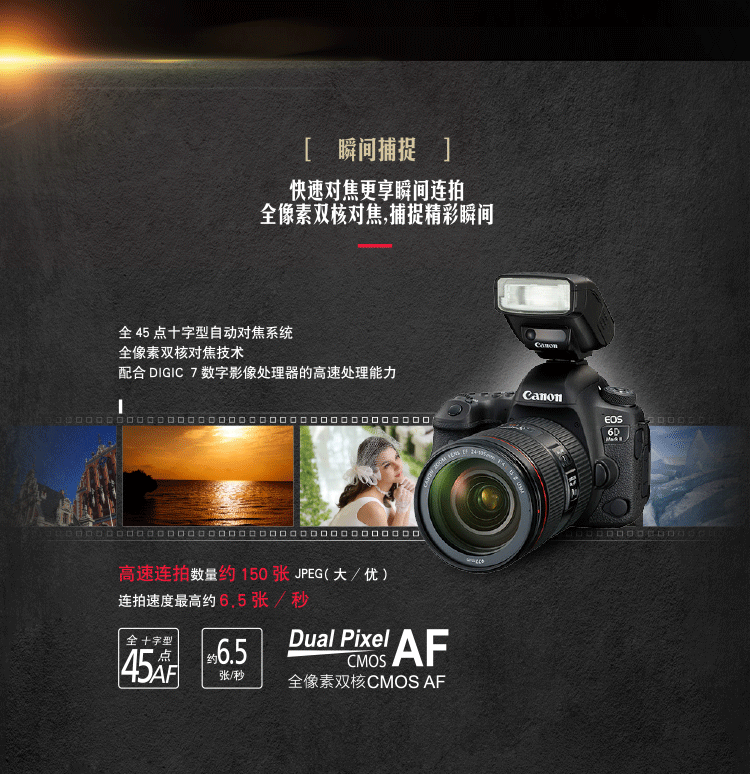 包裝清單  :   EOS 6D Mark II機(jī)身×1,電池充電器LC-E6E(含電源線)×1,鋰電池LP-E6N×1,相機(jī)寬背帶×1,EF 24-105mm f/4L IS II USM×1,鏡頭遮光罩EW-83M×1,保修卡×1,說明書×1,包裝盒×1