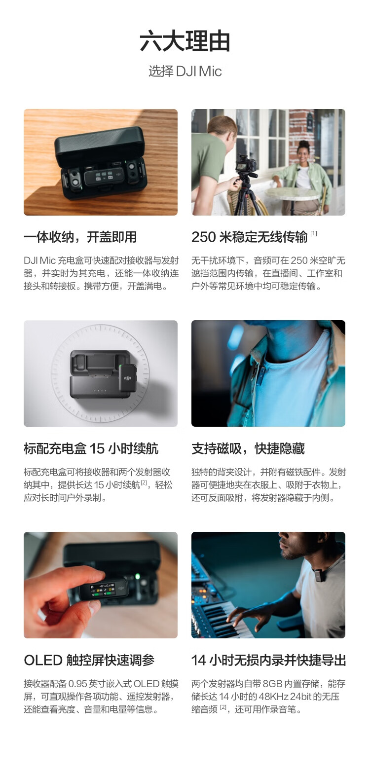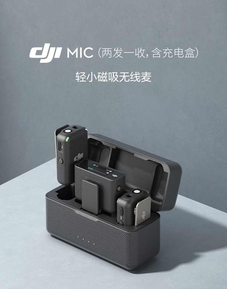 包裝清單  :   DJI Mic 接收器×1、DJI Mic 發(fā)射器×2、DJI Mic 充電盒×1、DJI Mic 相機(jī)連接線(3.5mm TRS)×1、DJI Mic 手機(jī)連接頭(Type-c 接頭)×1、DJI Mic 手機(jī)連接頭(Lightning 接頭)×1、DJI Mic 防風(fēng)毛套×2、DJI Mic 背夾磁鐵×2、DJI Mic 束口袋×1、DJI Mic 熱靴轉(zhuǎn)接板×1、充電線×1