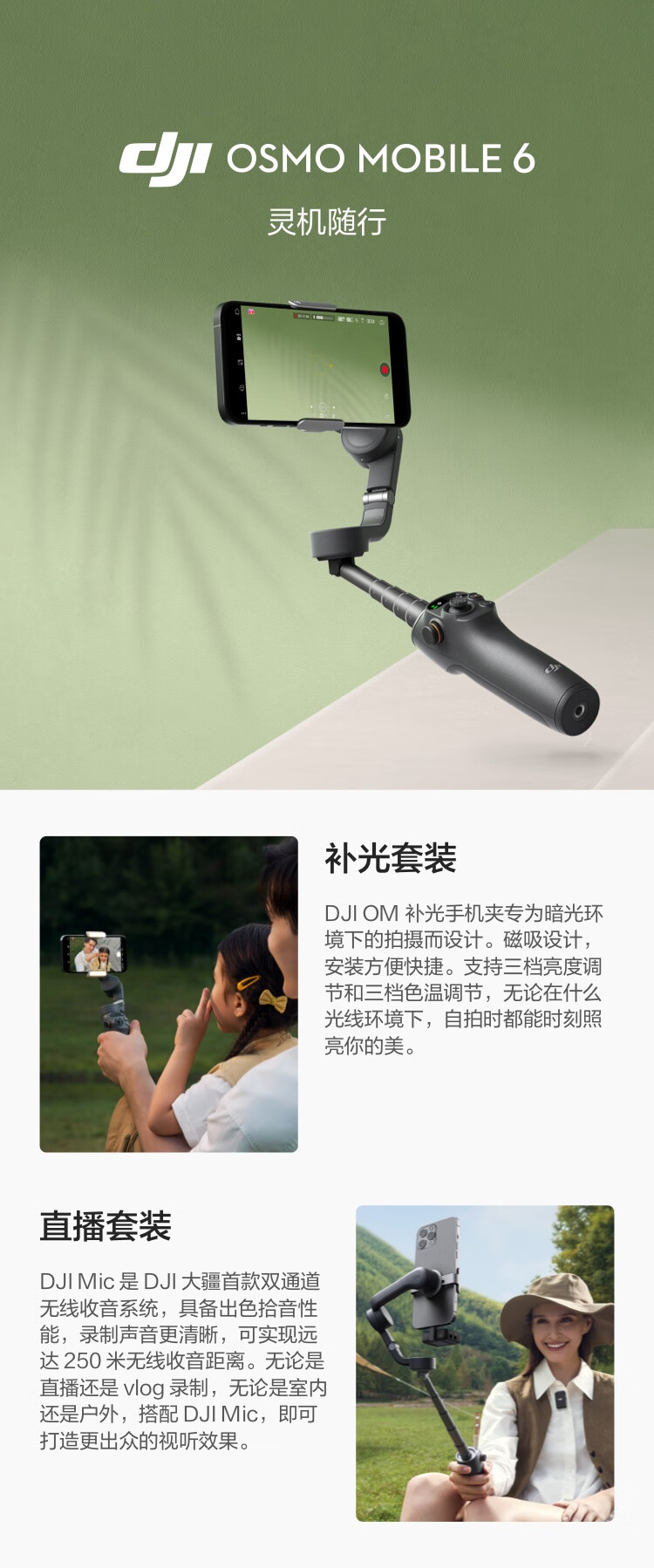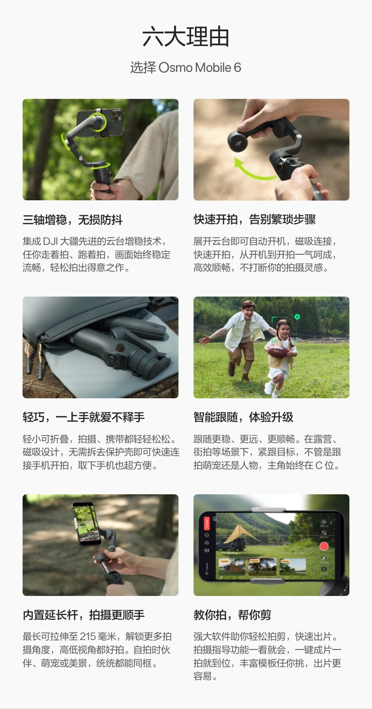 包裝清單  :   Osmo Mobile 6× 1、DJI OM 磁吸手機(jī)夾 3× 1、手持三腳架× 1、充電線× 1、束口袋× 1