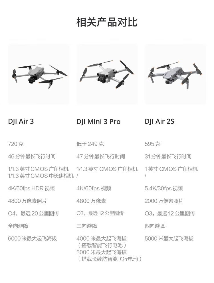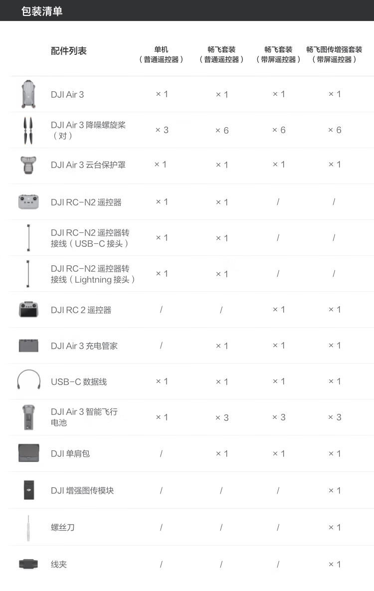 包裝清單  :   DJI Air 3 × 1, DJI Air 3 降噪螺旋槳(對) × 6, DJI Air 3 云臺保護(hù)罩 × 1, DJI RC 2 遙控器 × 1, DJI Air 3 充電管家 × 1, USB-C 數(shù)據(jù)線 × 1, DJI Air 3 智能飛行電池 × 3, DJI 單肩包 × 1